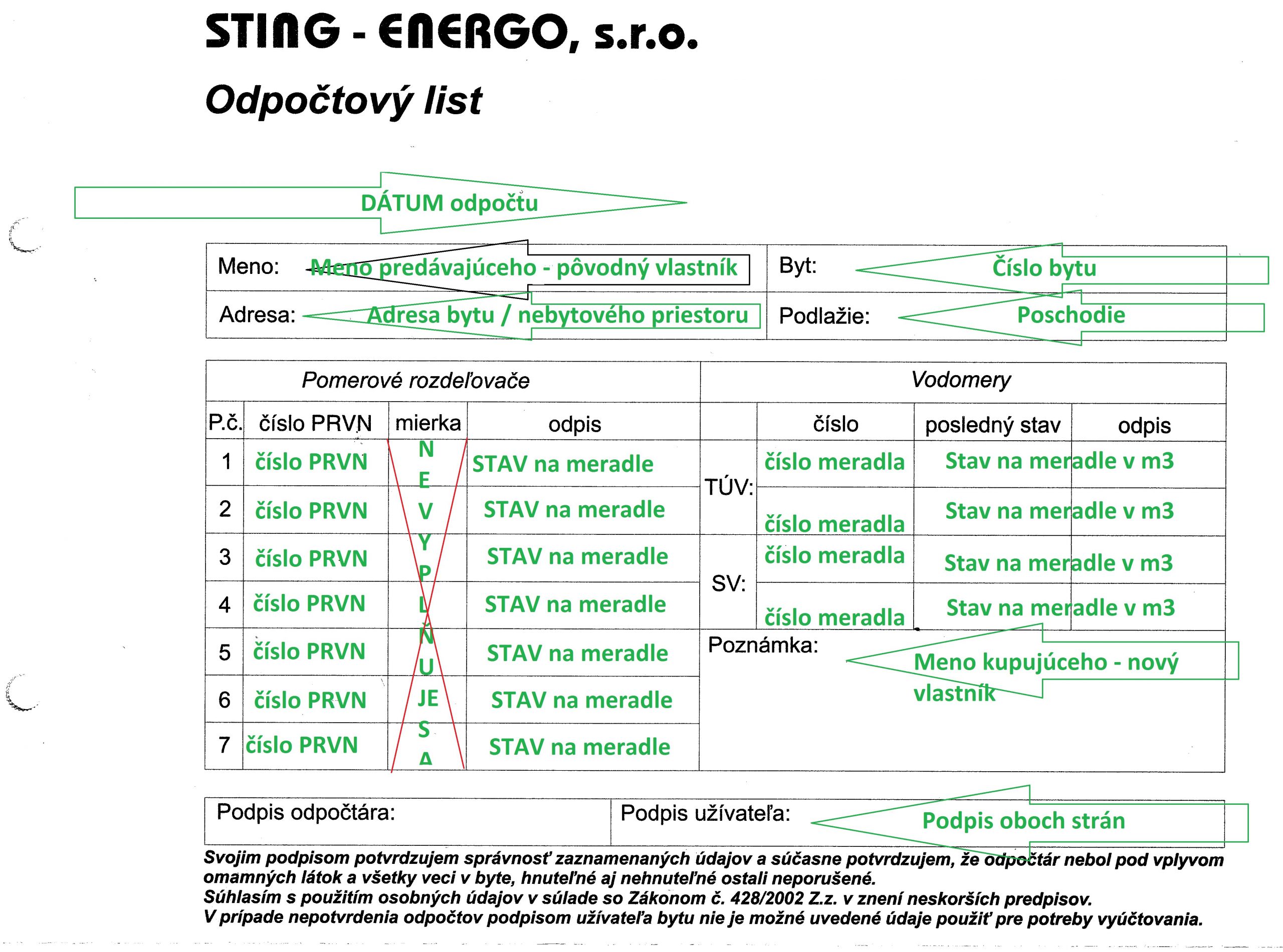 Odpis stavov energii SV, TÚV a ÚK pri predaji bytu alebo nebytového priestoru vykonajte priamo na riadne vyplnený Odpočtový list STING Energo.pdf, ktorý následne podpísaný predávajúcim a kupujúcim (zástupcom realitnej kancelárie) je potrebné odovzdať, prípadne zaslať mailom na Bytový podnik Poprad, s.r.o. .Kontakty nájdete v záložke Naši zamestnanci.
